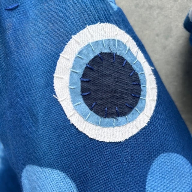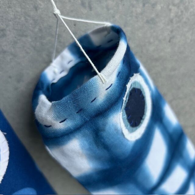 鯉のぼり生産のシーズンは冬。寒い時期にさらし生地を染めていきます。ドット柄、ビー玉絞り、板締め絞り、括り、縫い絞りなど、まるで染め柄見本みたいに様々な柄を見る事が出来ちゃう。染め上がったら縫製作業。目玉を付けるのは、ちくちく手仕事が得意な刺し子チームのメンバーさん。目玉が付いたら竹ひごを入れ、タコ糸をつけて完成!みんなの力を合わせて出来上がります。今回は大中小3種類の鯉のぼりをセットにして販売します。