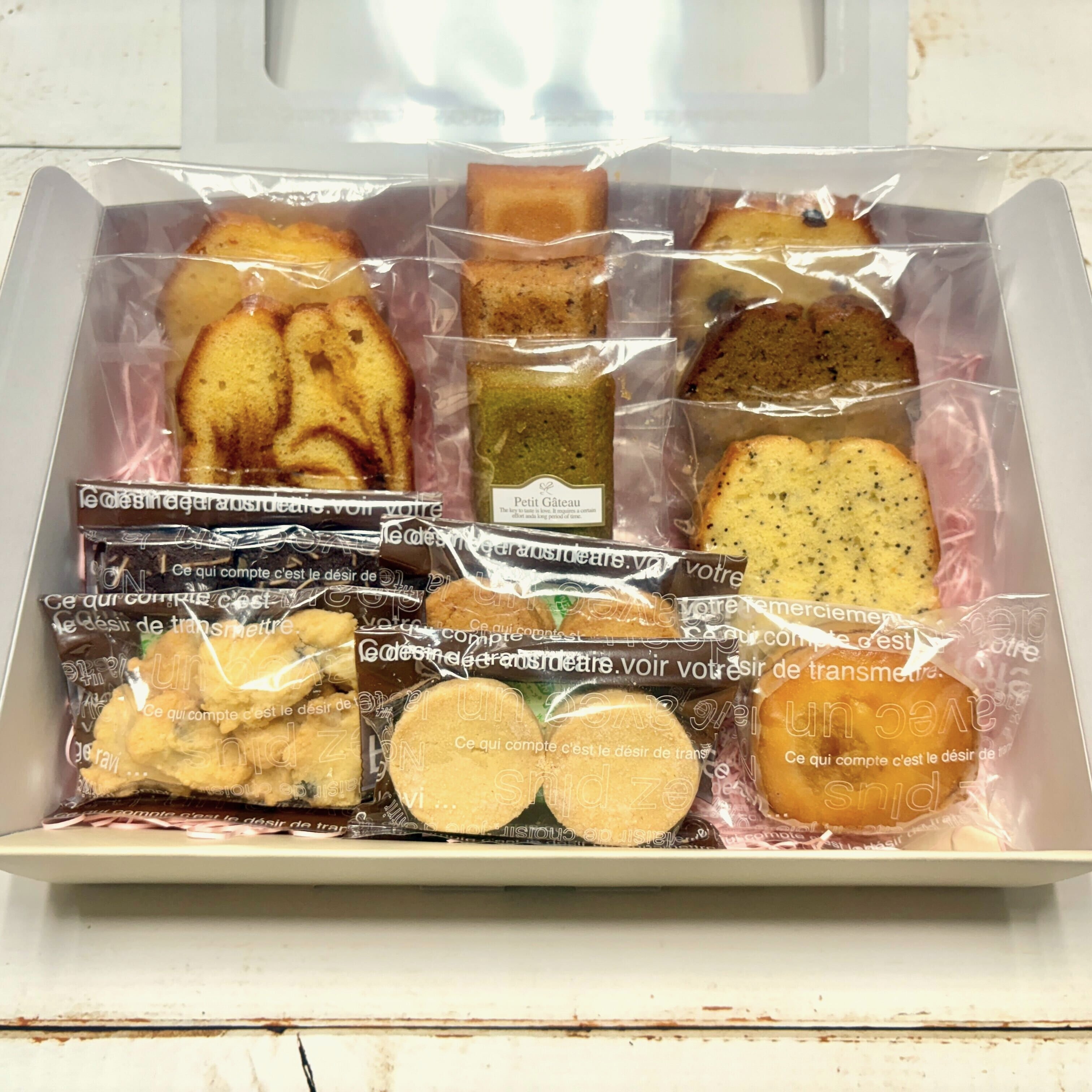 セット内容:パウンドケーキ 5個、フィナンシェ 3個、レモンカップ 1個、クッキー 4個(チョコチップクッキー、アーモンドココアクッキー、ココナッツクッキー、ショートブレッド)