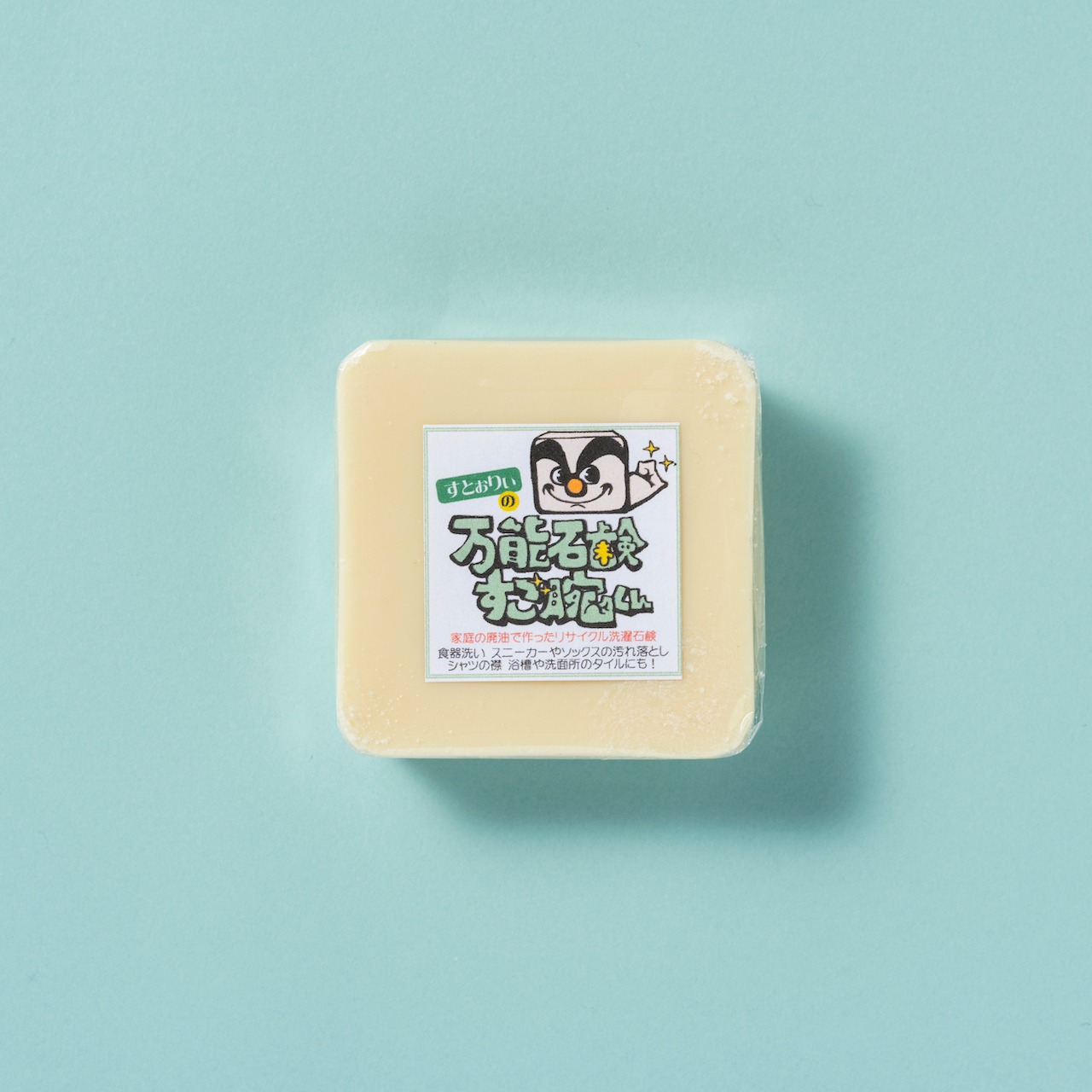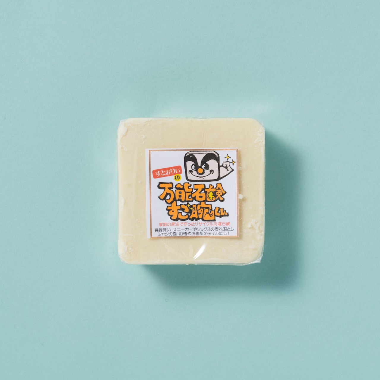 廃油となった食用油を使ったリサイクル石鹸、その名も「すご腕くん」。食器や換気扇の油汚れから、袖口・襟の汚れや運動後の泥んこ汚れ、口紅や化粧パフの汚れまで、さまざま汚れを落とす場面で活躍してくれるお役立ちグッズ。〈アディクションリハビリテーションセンターすとぉりぃ〉の定番商品です。