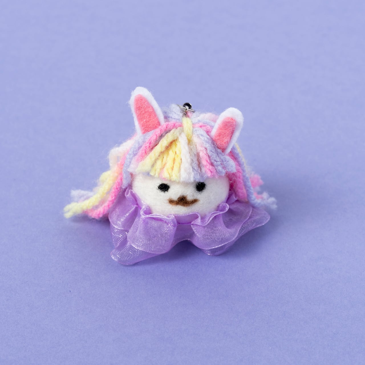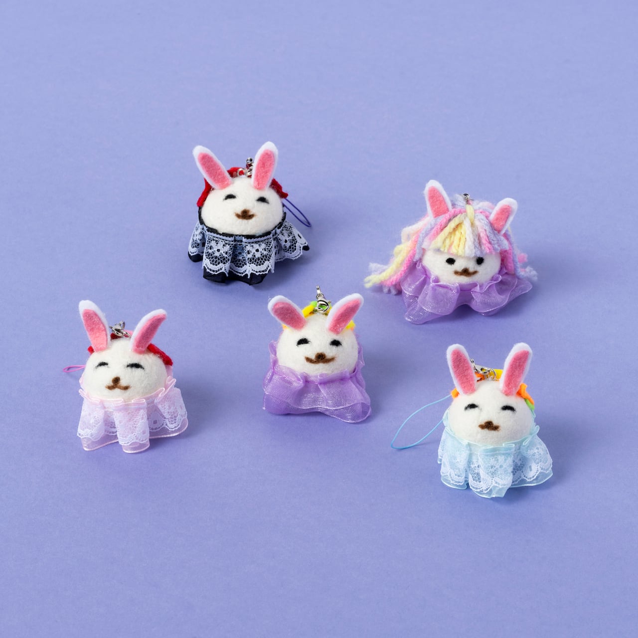 【店頭販売のみ】もはや、アイドル然とした輝きと存在感を放つ5匹のうさぎたち。まん丸胴体に、にっこりスマイル。ロマンチックなレースドレスに、鮮やかなリボン飾り。今時なカラフルメッシュヘアのうさぎも! 手に取った瞬間から目が離せなくなるこのストラップ、すでに取り扱いショップでも大きな反響があるのだとか。