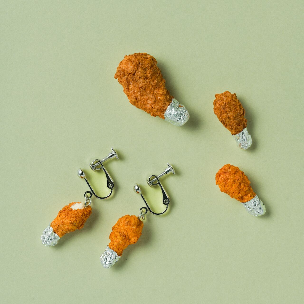 フライドチキンという特殊なモチーフですが、そのシンプルさゆえ、耳につけても案外違和感なし。むしろ「かわいい」と思えるはず⁉ 金具なしのチキンにはチェーンを取り付けて、ネックレスにしてもいいかもしれません。〈ゆに〉では今後、フライドチキン以外にも、ミニチュアフードのアクセサリーや玩具を展開していく予定です。どうぞお楽しみに!